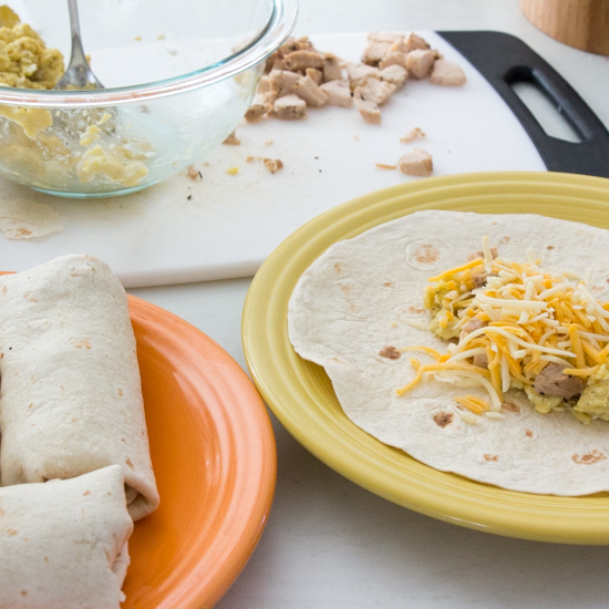 3. Prepare burritos: place eggs in center of tortilla, add chicken, and cheese. Fold sides in on the filling and roll up from the unrolled sides. (Get my “tutorial” on how to roll a perfect burrito here.)