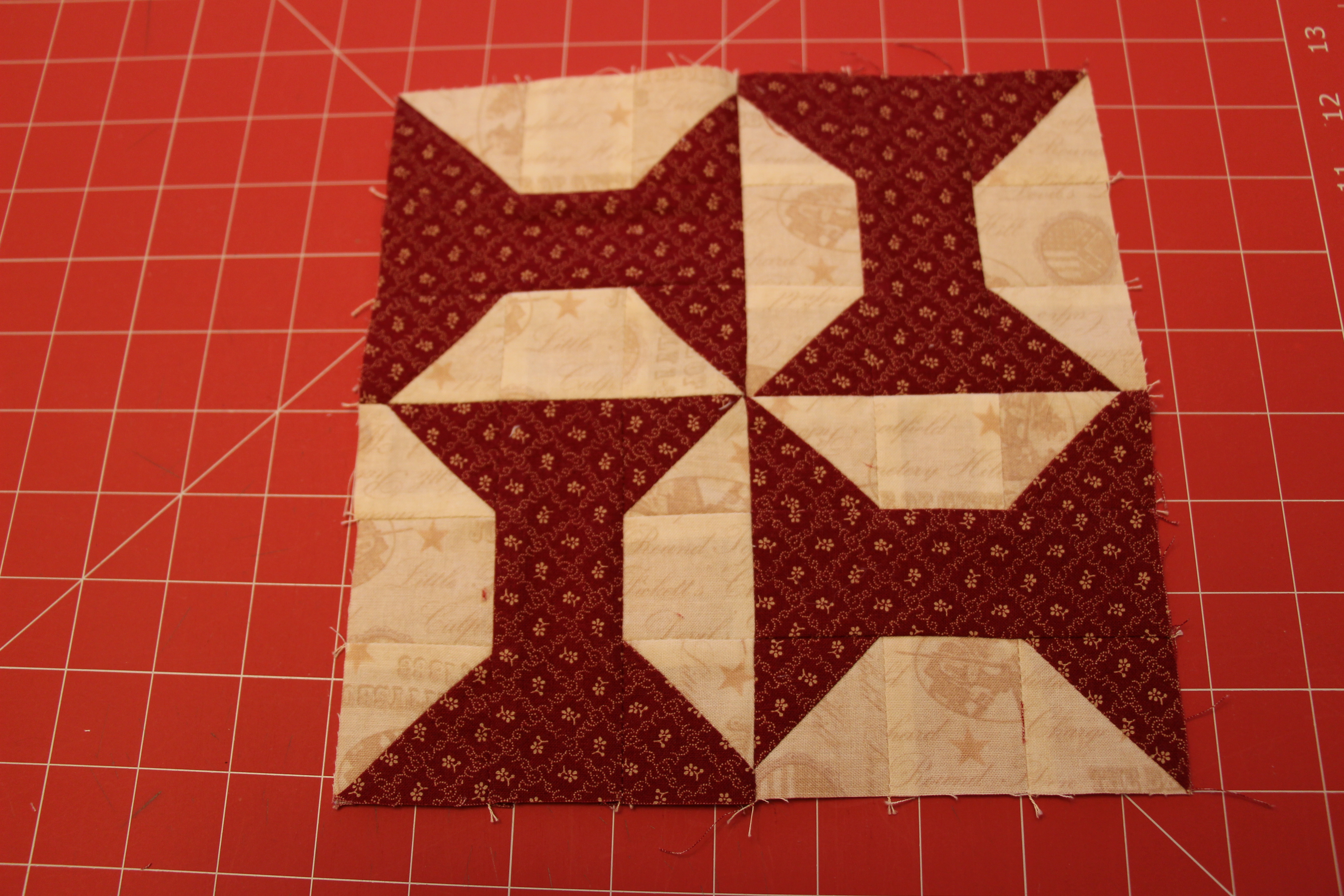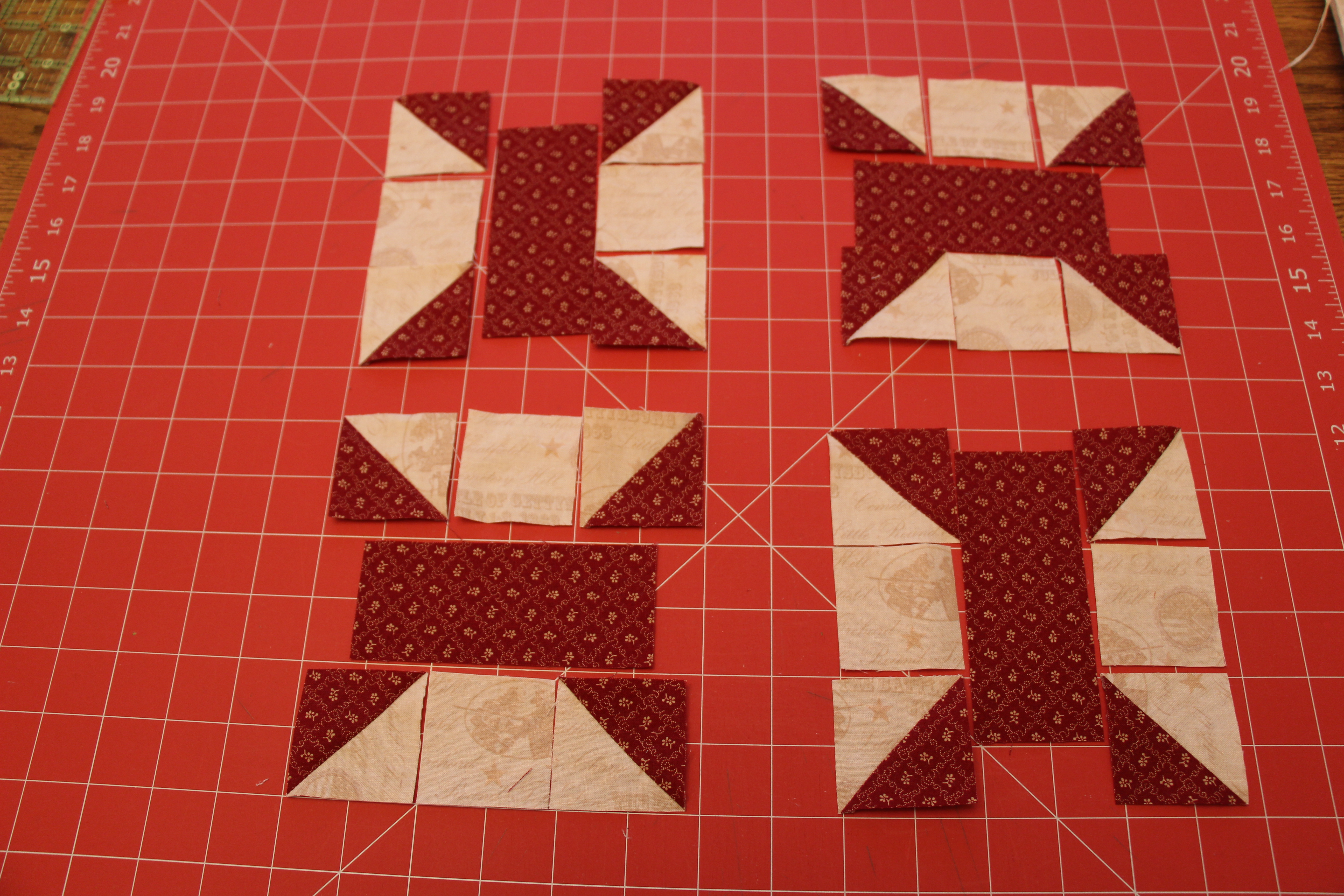 Use the 2 squares of 2 1/2″ red and white to create 4 Half Square Triangles (HSTs) trimmed down to 1 7/8″. Click here for my tutorial on how to make Half Square Triangles.