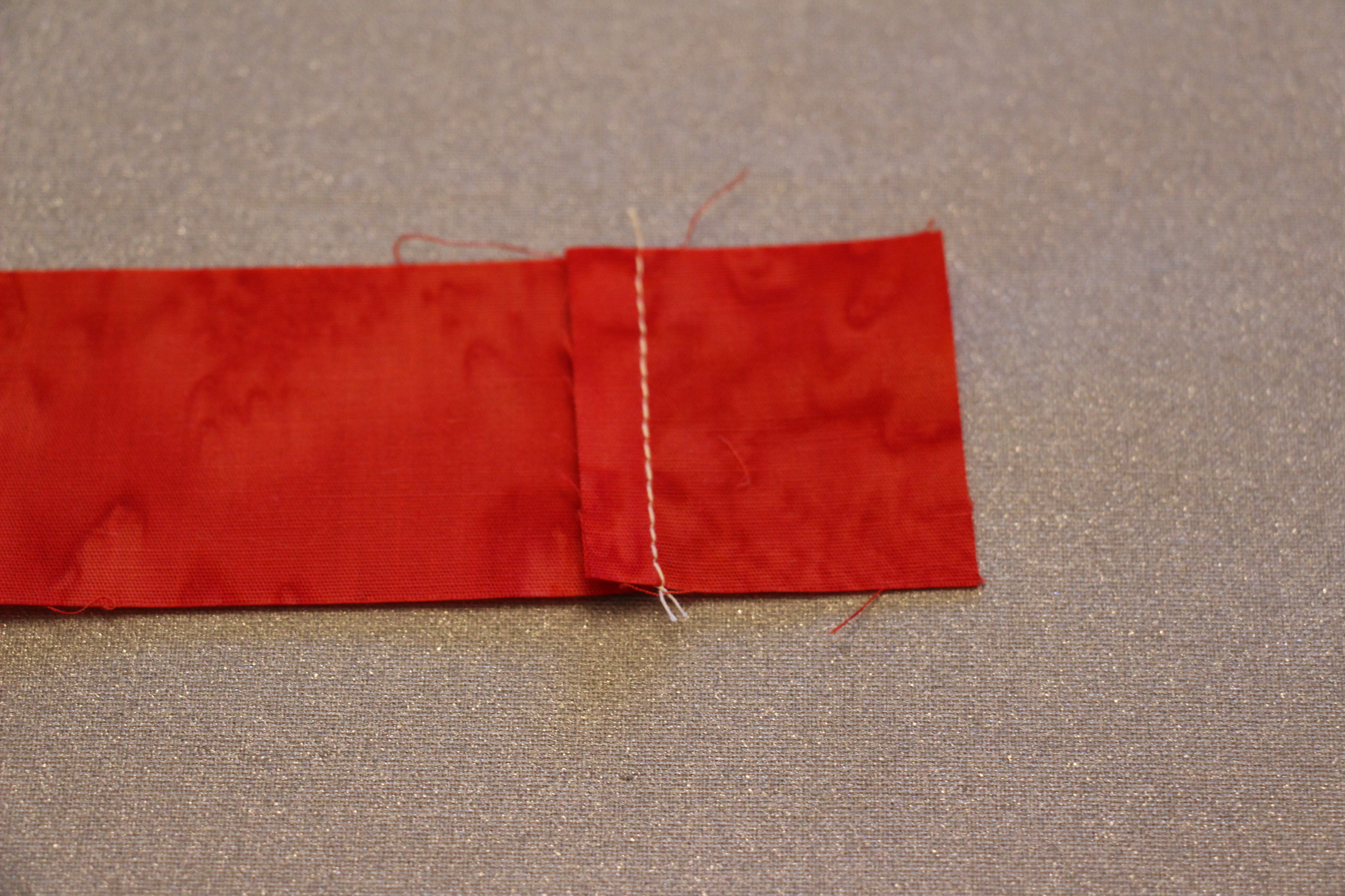 Sew the vertical sashing strips onto the blocks, creating a row.